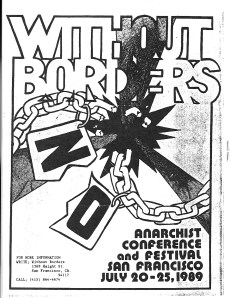 ‘Without Borders’ was the last of the 1980s anarchist conferences / gatherings / festivals that were held in the US and Canada. These included Chicago (1986), Minneapolis (1987) and Toronto (1988). Thousands of people attended the San Francisco event. Among other things, the Love & Rage project emerged from the gatherings. This specific image is scanned from the zine A New Iron Column. (Click on image to enlarge.)