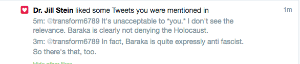 - Jill Stein, or whoever is running her twitter account, has refused to reply to tweets, but has “liked” a tweet saying it’s acceptable that Baraka is working with a Holocaust Denier.